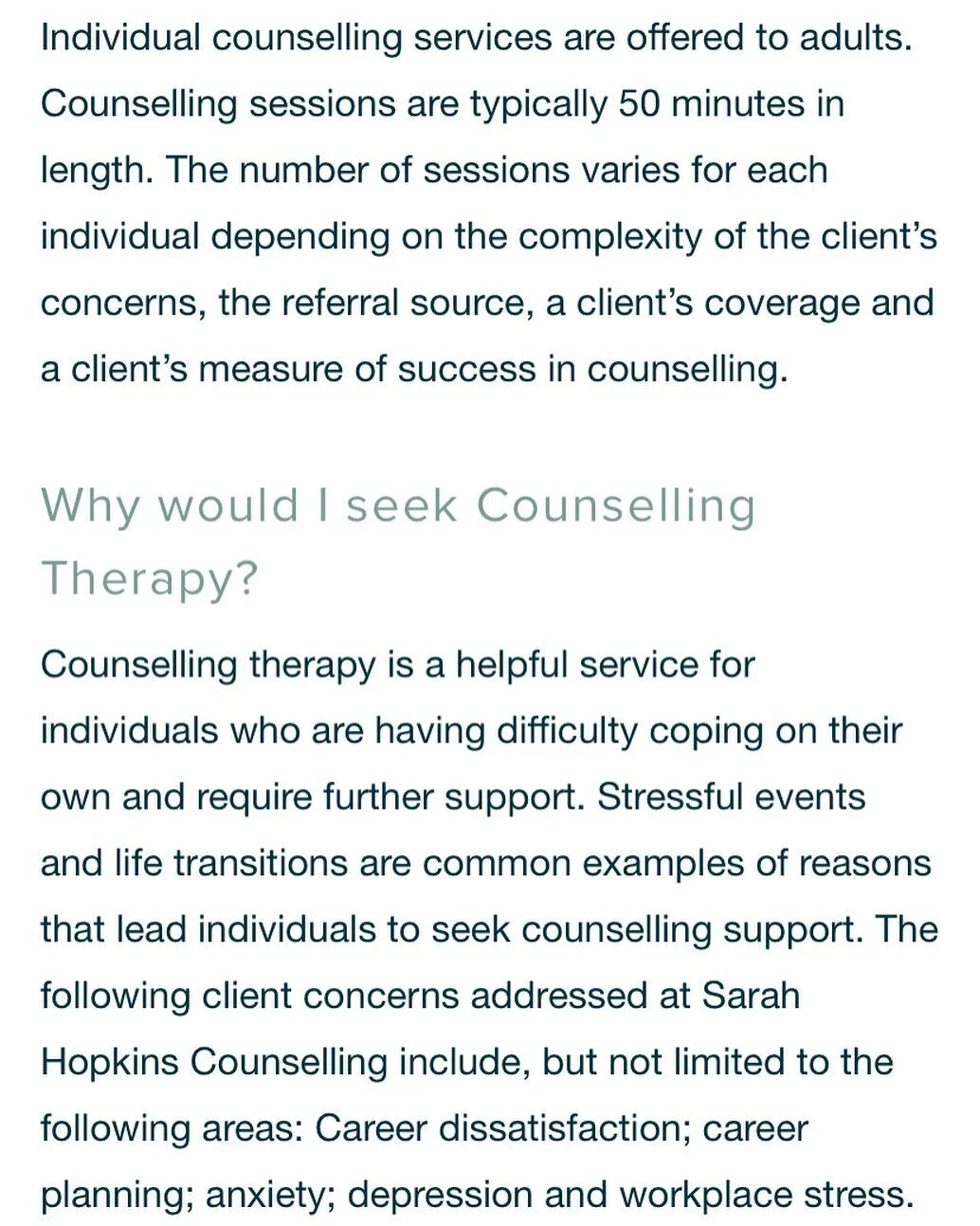 Sarah Hopkins Counselling is not accepting new referrals in 2025. Please contact to schedule an appointment with Sarah Hopkins.